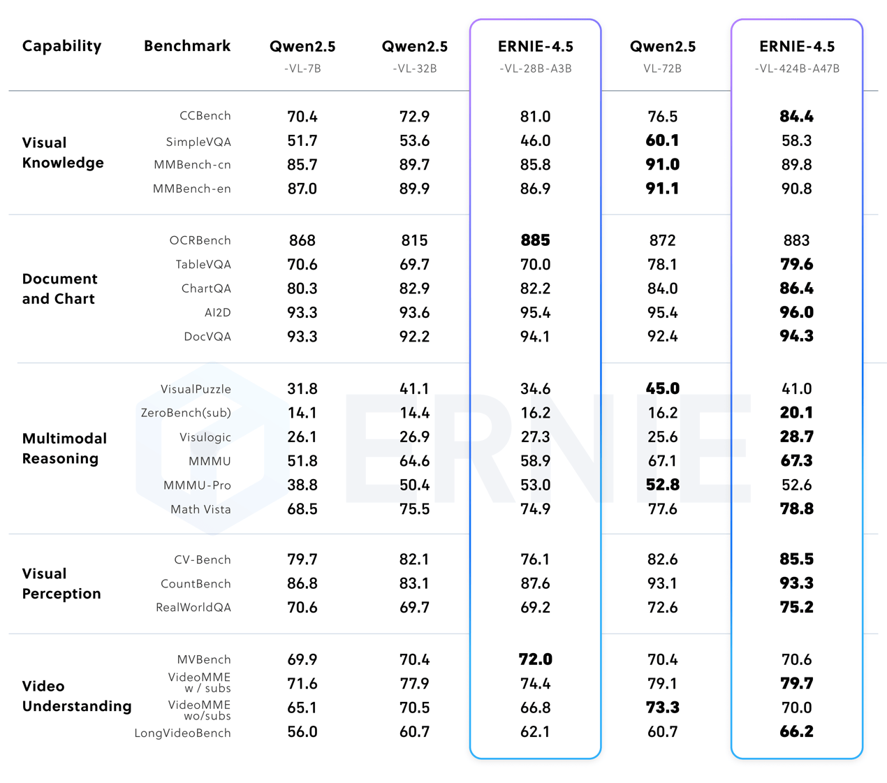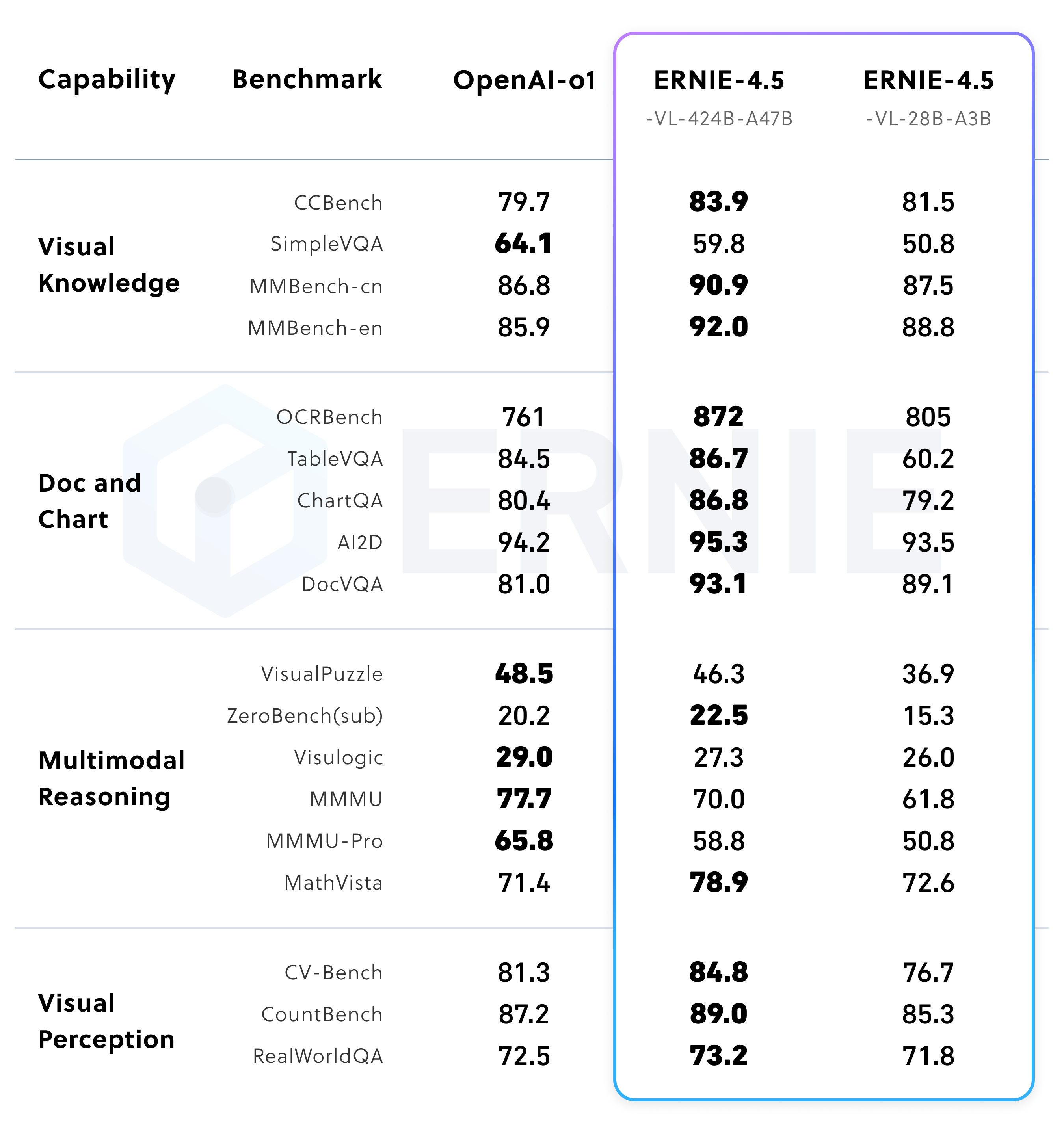 在文本模型方面,文心大模型4.5开源系列基础能力强、事实准确性高、指令遵循能力强、推理和编程能力出色,在多个主流基准评测中超越DeepSeek-V3、Qwen3等模型。在多模态模型方面,文心大模型4.5开源系列拥有卓越的视觉感知能力,同时精通丰富视觉常识,并实现了思考与非思考统一,在视觉常识、多模态推理、视觉感知等主流的多模态大模型评测中优于闭源的OpenAI o1。此外,在轻量模型上,文心4.5-21B-A3B-Base文本模型效果与同量级的Qwen3相当,文心4.5-VL-28B-A3B多模态模型也是目前同量级最好的多模态开源模型,甚至与更大参数模型Qwen2.5-VL-32B不相上下。
