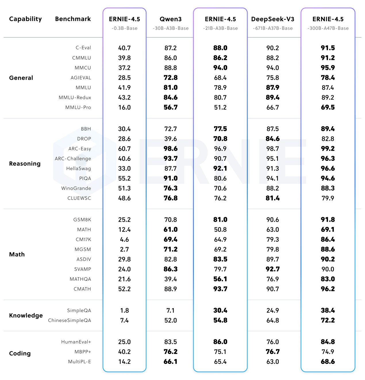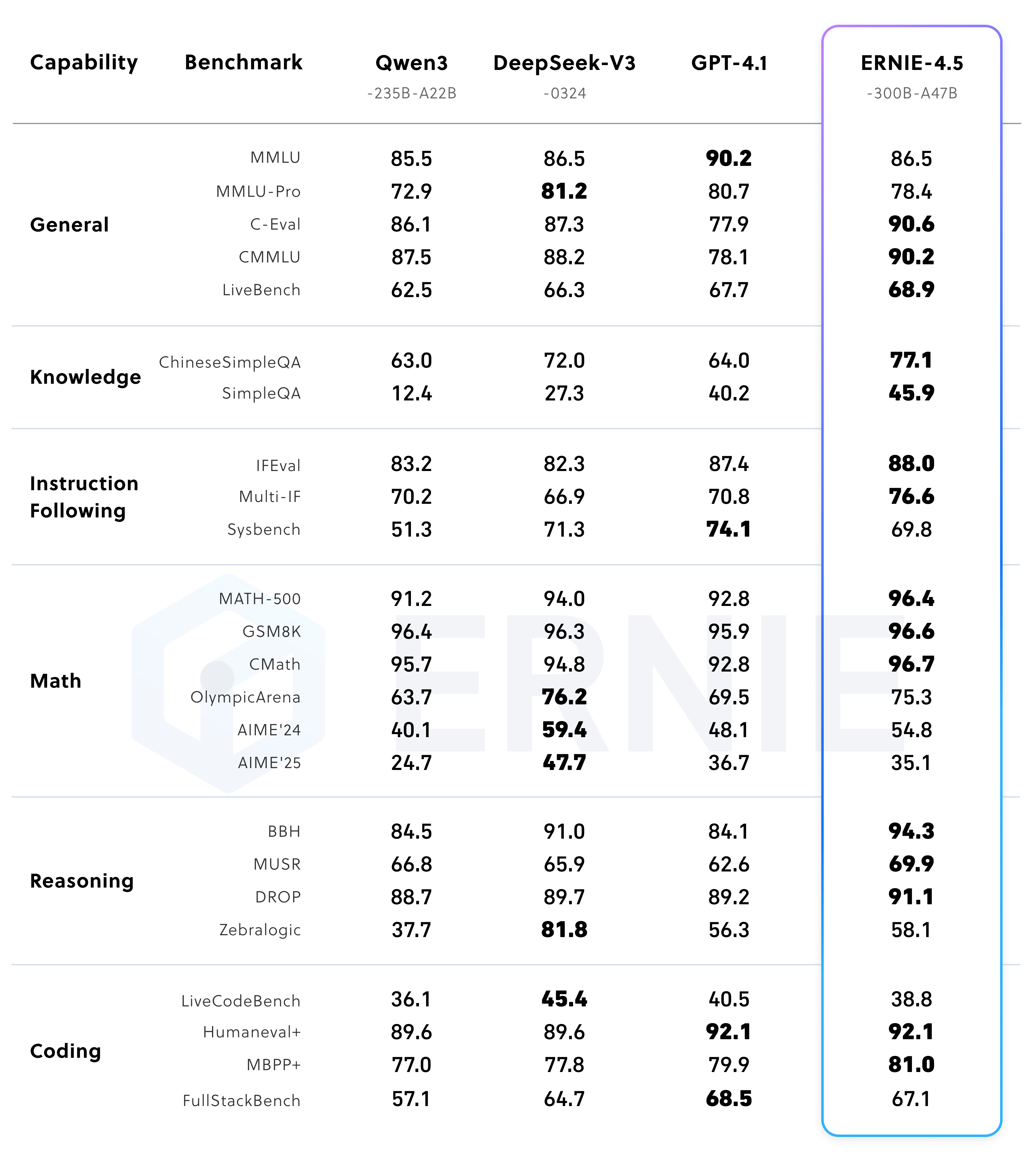 文心4.5-300B-A47B模型在主流基准测试中表现优异