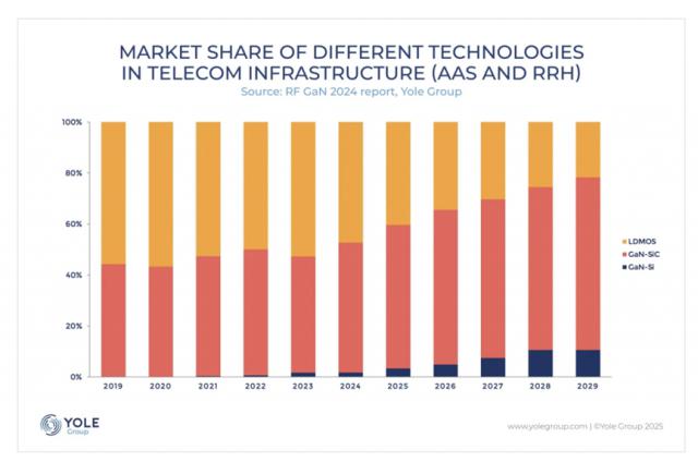 从经济角度来看,硅基氮化镓 ( GaN-on-Si ) 在低功耗应用中仍与成熟的 LDMOS 竞争,而这些应用的每瓦成本优势较小。然而,其应用正在不断增长。市场预测显示,到 2029 年,硅基氮化镓在基站功率放大器 ( PA ) 中的份额可能从目前的个位数增长到 10% 以上(图 2),2025 年至 2030 年的复合年增长率约为 45%,超过碳化硅基氮化镓 ( GaN-on-SiC ) 6% 的增长率,这得益于晶圆加工规模扩大、良率提高以及 OEM 厂商的广泛接受度带来的成本降低。